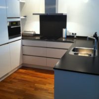 Moderne greeploze keuken in hoogglans wit met zwart keukenblad.